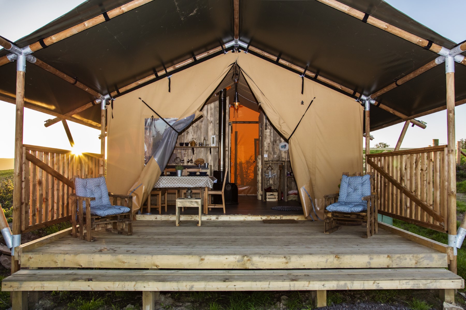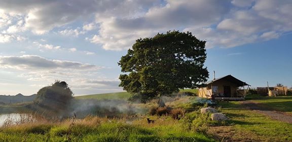 Under the Oak Glamping has proved very popular with couples. It’s not surprising really – everything about the safari tent says romance. The incredible Welsh box bed is always a hit. The love tub- our cosy, wood fired hot tub – is perfectly quiet so you can sit back and watch the sun go down and the stars come out. Some people like to take a stroll with the dogs, others prefer to chill on the veranda with a few drinks and admire the fabulous panoramic view of the South Wales hills stretching down to the sea in the distance.